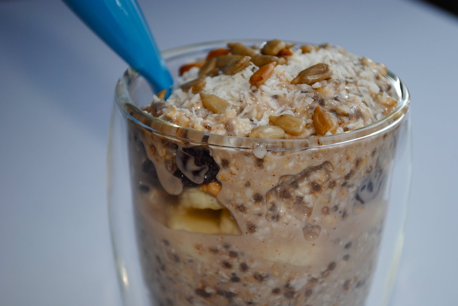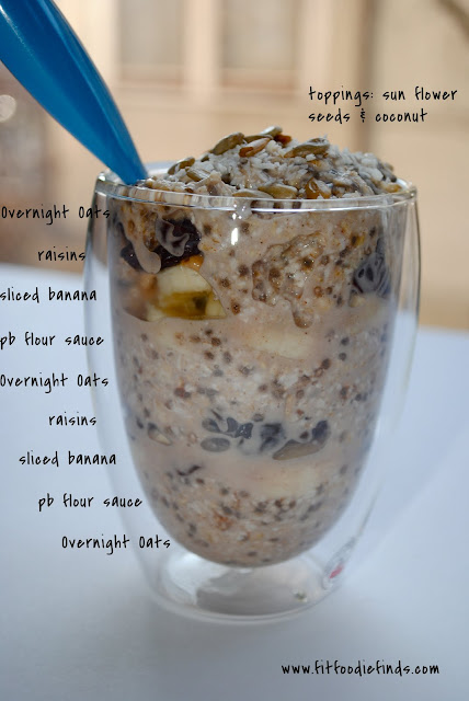 Step 2: Assemble your parfait! I layered my oats with sliced banana, peanut flour sauce (peanut flour + milk), and raisins. Then, I topped my parfait with more goodies: sun flower seeds and unsweetened coconut shavings.